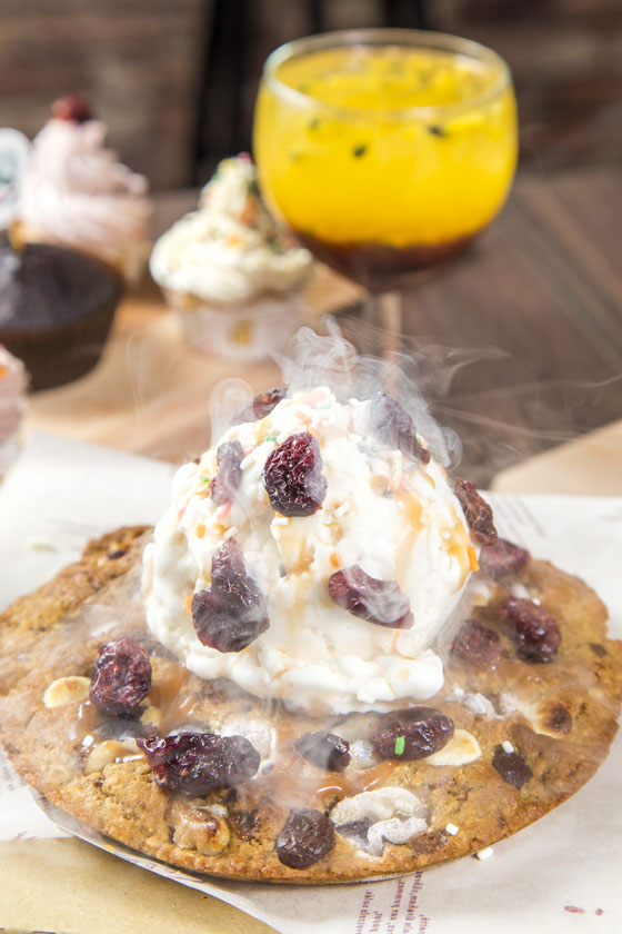剛做好的分子冰淇淋放上餅乾時還散發著煙白的冰霧,灑上酸甜可口的蔓越莓,以酥軟香脆的手工餅乾代替威化餅,又脆又甜好涮嘴!
