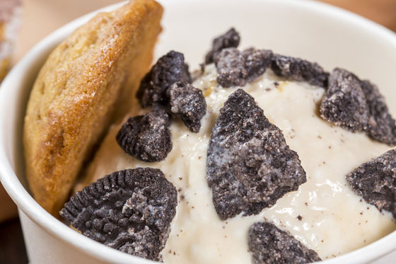 所謂分子冰淇淋便是透過液態氮在極低溫下急速冷凍,使得冰淇淋的冰晶更為細膩,口感相對滑順綿密,這樣的冰淇淋作法始於1970年法國餐廳某位主廚。現做的冰淇淋不斷噴出白白的冰霧,在急凍下原料漸漸結成細膩的冰晶,灑上歐立歐餅乾,口感前所未有的特別!